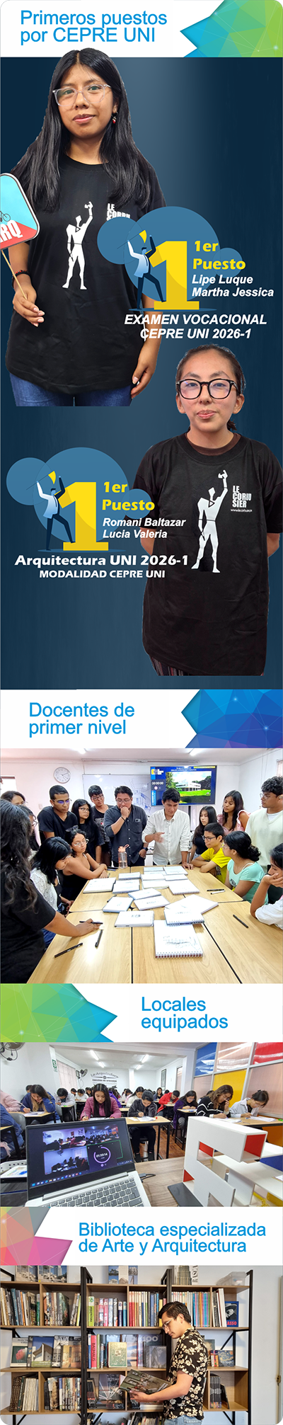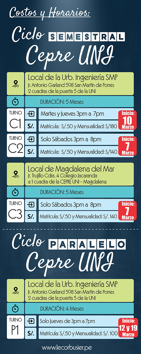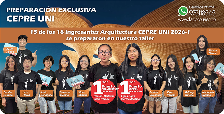 El Ciclo Semestral CEPRE UNI es un curso teórico practico completo de preparación para afrontar las diferentes evaluaciones (PRACTICAS CALIFICADAS Y VOCACIONAL FINAL) que tienen que rendir los postulantes por esta modalidad a la carrera de ARQUITECTURA, Los temas y nivel se distribuyen de forma escalonada, permitiendo al alumno avanzar poco a poco con cada bloque de temas que se van tocando desde cero, el primer mes de trabajo es escencial en la etapa formativa de este ciclo ya que le brinda a los alumnos las herramientas gráficas para afrontar los temas de los siguientes meses. Nuestras aulas están equipadas para brindar las clases de una manera didáctica, el número de alumnos es el adecuado para trabajar grupal y personalmente. Al alumno se le brinda material físico exclusivo cada clase, también se refuerza con material digital que se colocará en un Aula Virtual, el material tanto físico y digital esta incluido en el pago. Ademas de las clases, el alumno sera constantemente evaluado con Practicas y Simulacros Tipo Admisión, previa a cada práctica que tendrán que rendir en la UNI. Se darán seminarios extras, tendrán acceso a la Biblioteca con mas de 300 libros de Arte y Arquitectura así mismo tendrán asesorías personales para que el alumno logre dominar todos los temas. |