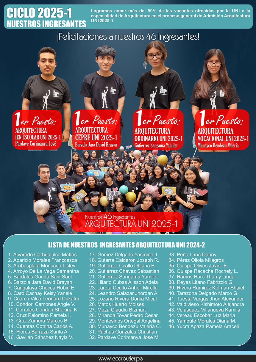 El Taller Le Corbusier, es una institucion con 29 años de experiencia en la Preparación exclusiva para rendir el Examen de Aptitud Vocacional de Arquitectura UNI, a traves de estos años hemos desarrollado un curso de alto nivel que nos ha permitido lograr cientos de ingresantes, ocupando cerca del 80% del total de vacantes que ofrece la UNI a la especialidad de Arquitectura. En la siguiente lista de años, podras encontrar la relacion de nuestros ingresantes a traves de estos 29 años de trabajo ininterrumpido, abocados a la formacion de los FUTUROS ARQUITECTOS DEL PERÚ.