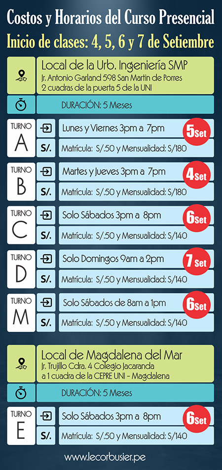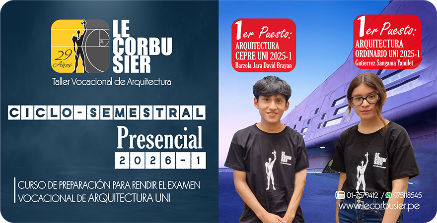 El Ciclo Semestrales un curso de preparación exclusiva para rendir el Examen Vocacional de Arquitectura UNI, ademas de servir como base o Pre Formación Arquitectónica, para todos los que desean iniciar la carrera con conocimientos amplios sobre Arquitectura, los temas y nivel se distribuyen de forma escalonada, permitiendo al alumno avanzar poco a poco con cada bloque de temas que se van tocando desde cero y de esa forma llegar al examen con un alto nivel de preparación ya que el curso es de Alto rendimiento para enfrentar con éxito el Examen Vocacional. El curso permitirá al alumno rendir los Vocacionales de todas las modalidades de Ingreso (Cepre UNI, Ordinario y Escolar). Ademas de las clases, el alumno sera constantemente evaluado con Simulacros tipo Examen Vocacional, tendra acceso a la Biblioteca con mas de 300 libros de Arte y Arquitectura y se otorgaran becas de acuerdo al desempeño del alumno en el curso. |
