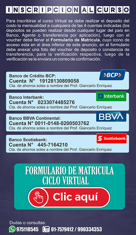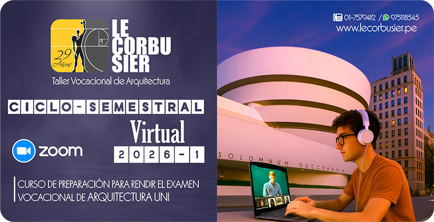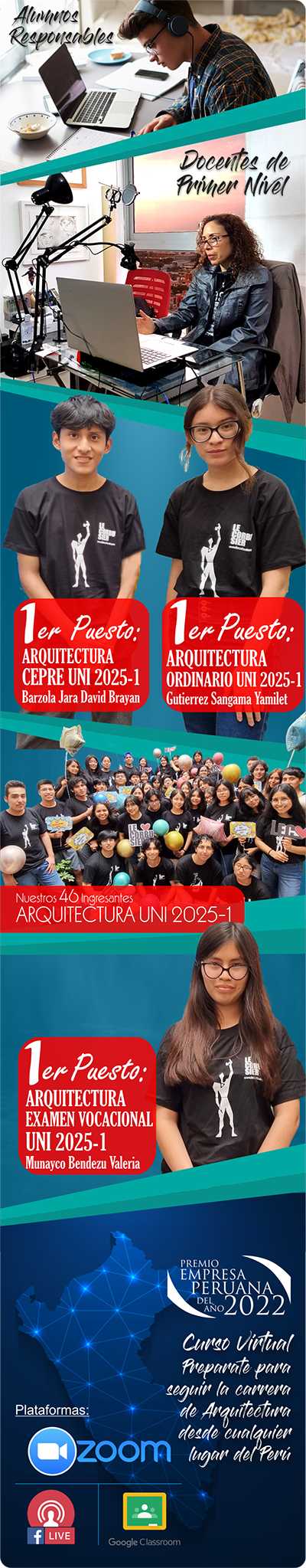 El Ciclo SEMESTRAL VIRTUALes un curso de preparación exclusiva para rendir el Examen Vocacional de Arquitectura UNI, se desarrollaran todos los temas concernientes al Examen Vocacional, el curso es formativo, ideal para postulantes sin experiencia previa, o postulantes con preparación que quieren competir al más alto nivel. los temas se trabajaran desde el nivel mas basico y de forma escalonada hasta desarrollar ejercicios de alto nivel, ademas los alumnos rendiran Simulacros de Examen Vocacional y analisis de Examenes pasados. |